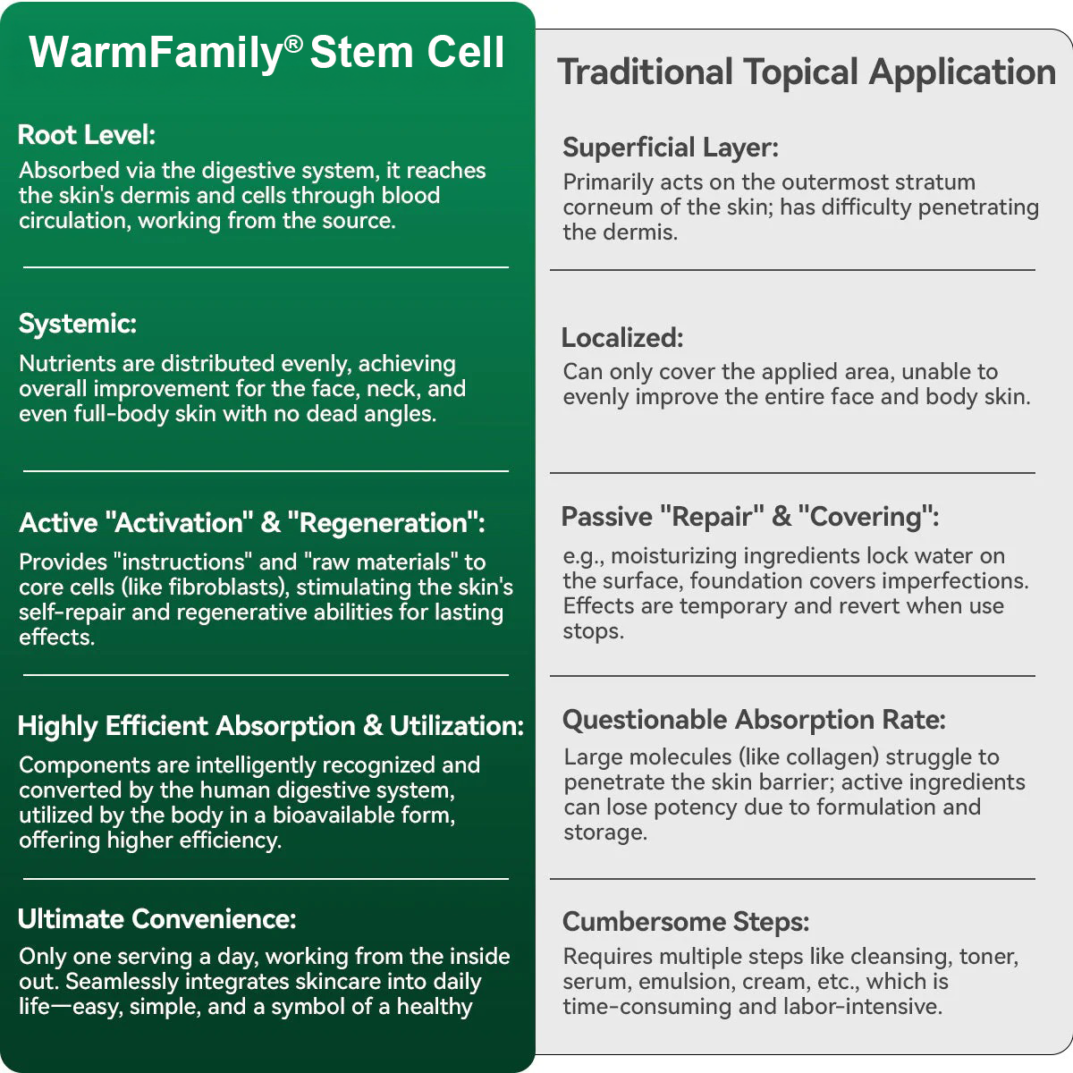 โ Rapid absorption: This fast-acting liquid formula can directly deliver the core ingredient Stem cell to the cells, with a mild but significant effect, especially suitable for those with digestive system sensitivity.